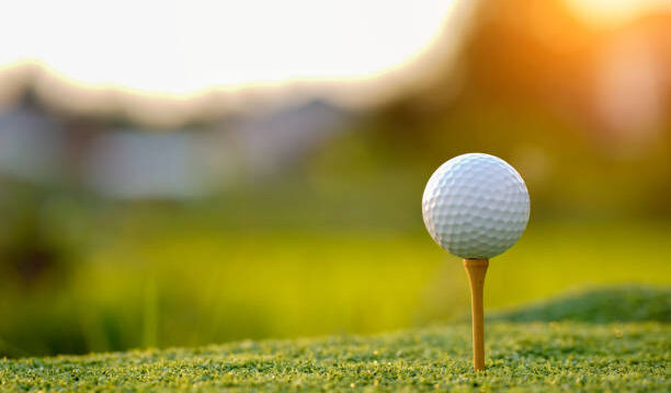 A close-up of a golf ball sitting on a wooden tee, placed on green grass with a blurred background and warm sunlight in the distance.